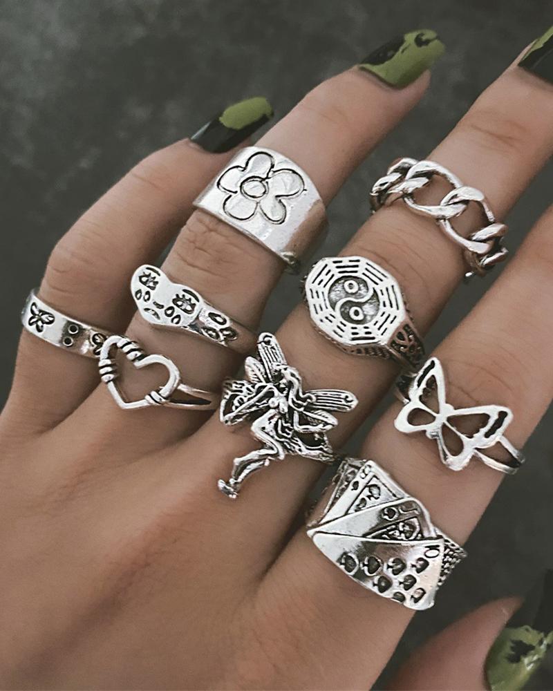 9pcs Hollow Out Butterfly Heart Geometric Stackable Rings Set, Silver