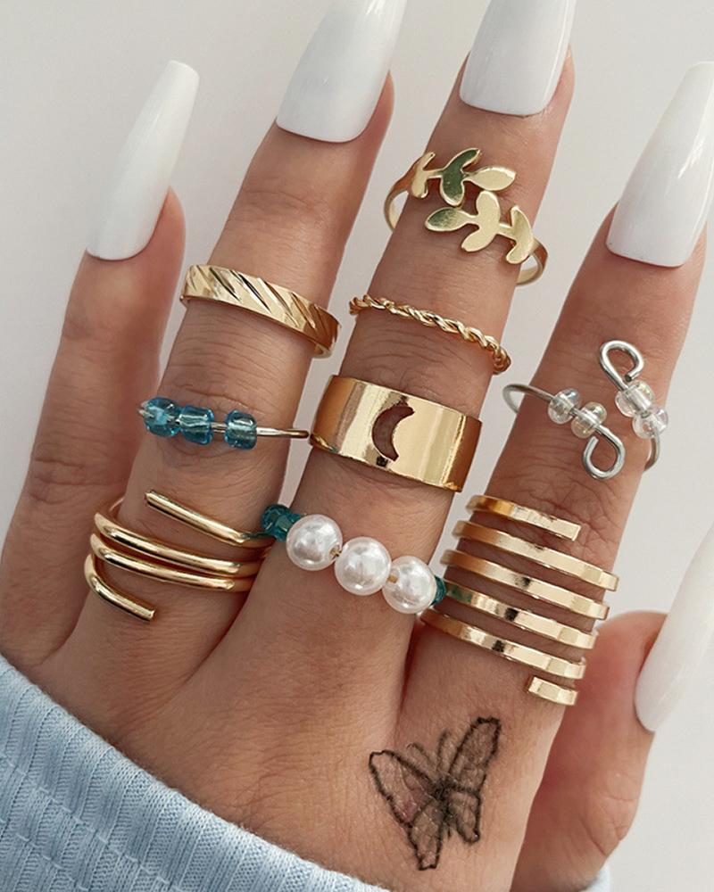 9pcs Leaf Moon Shaped Beaded Stackable Ring Set, Style1