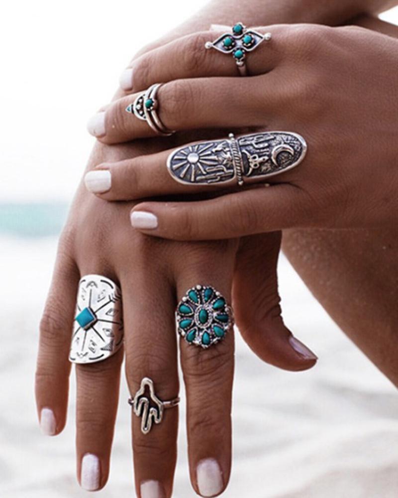 9pcs Retro Stackable Geometric Turquoise Rings Set, Silver