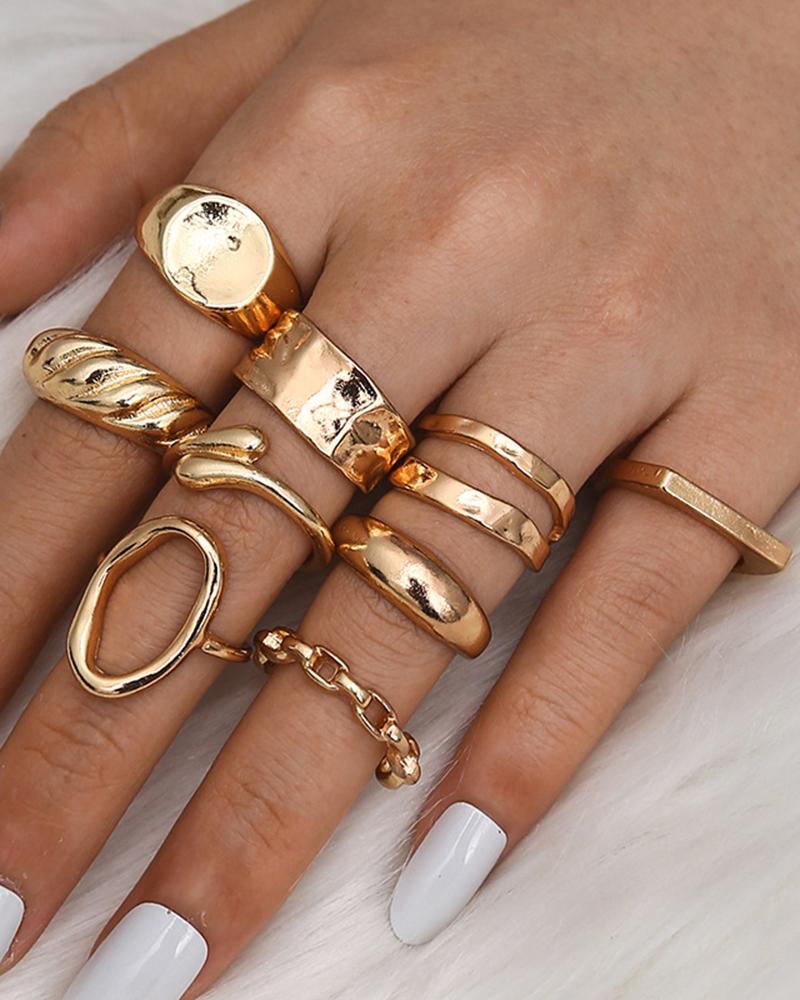 9pcs Stackable Geometric Hollow Rings Set, Gold