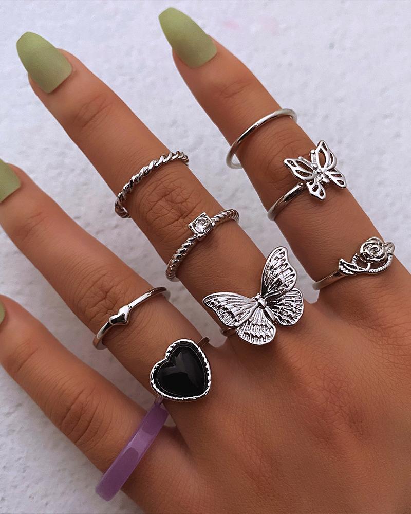 9pcs Stackbale Heart Butterfly Shaped Rings Set, Silver