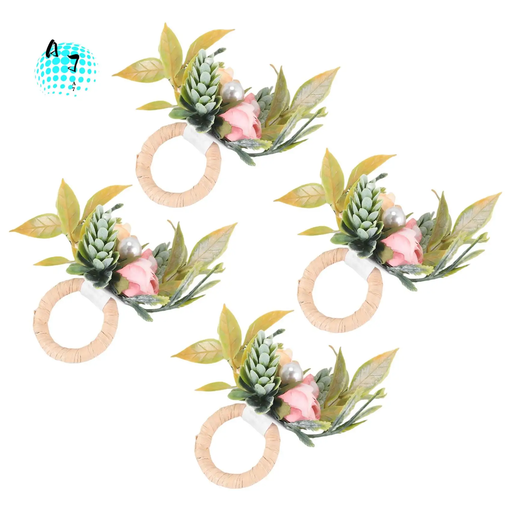 A07F-Набор из 4 колец для салфеток с двойными розами, кольца для салфеток с розовыми цветами и ягодами и зелеными листьями, держатели для колец для салфеток ручной работы