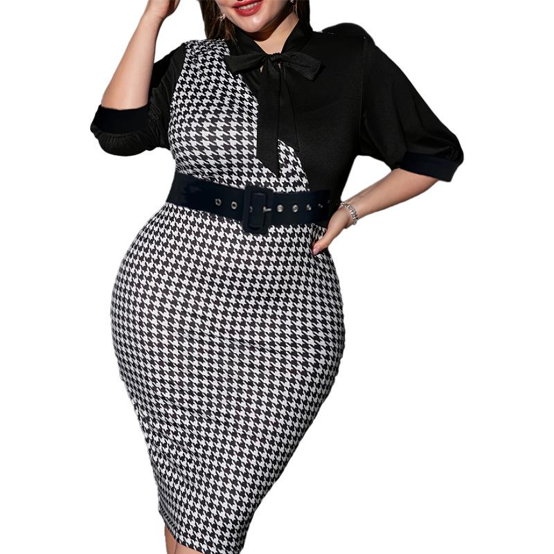 A24-516 Узкое вечернее платье в европейском и американском стиле с узором «гусиная лапка» — модное, большой размер 4XL чёрный/белый