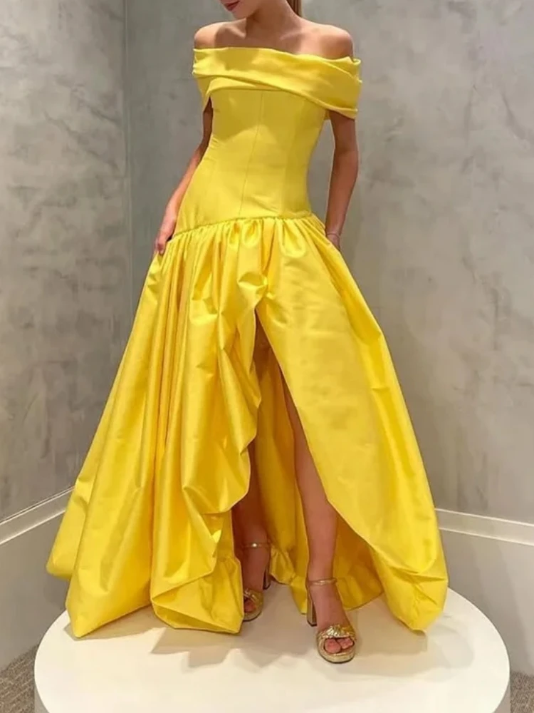A2519 Простые желтые платья для выпускного вечера Длинные с открытыми плечами А-силуэта с разрезом спереди Вечеринка для особых случаев Формальный вечер Коктейль по индивидуальному заказу