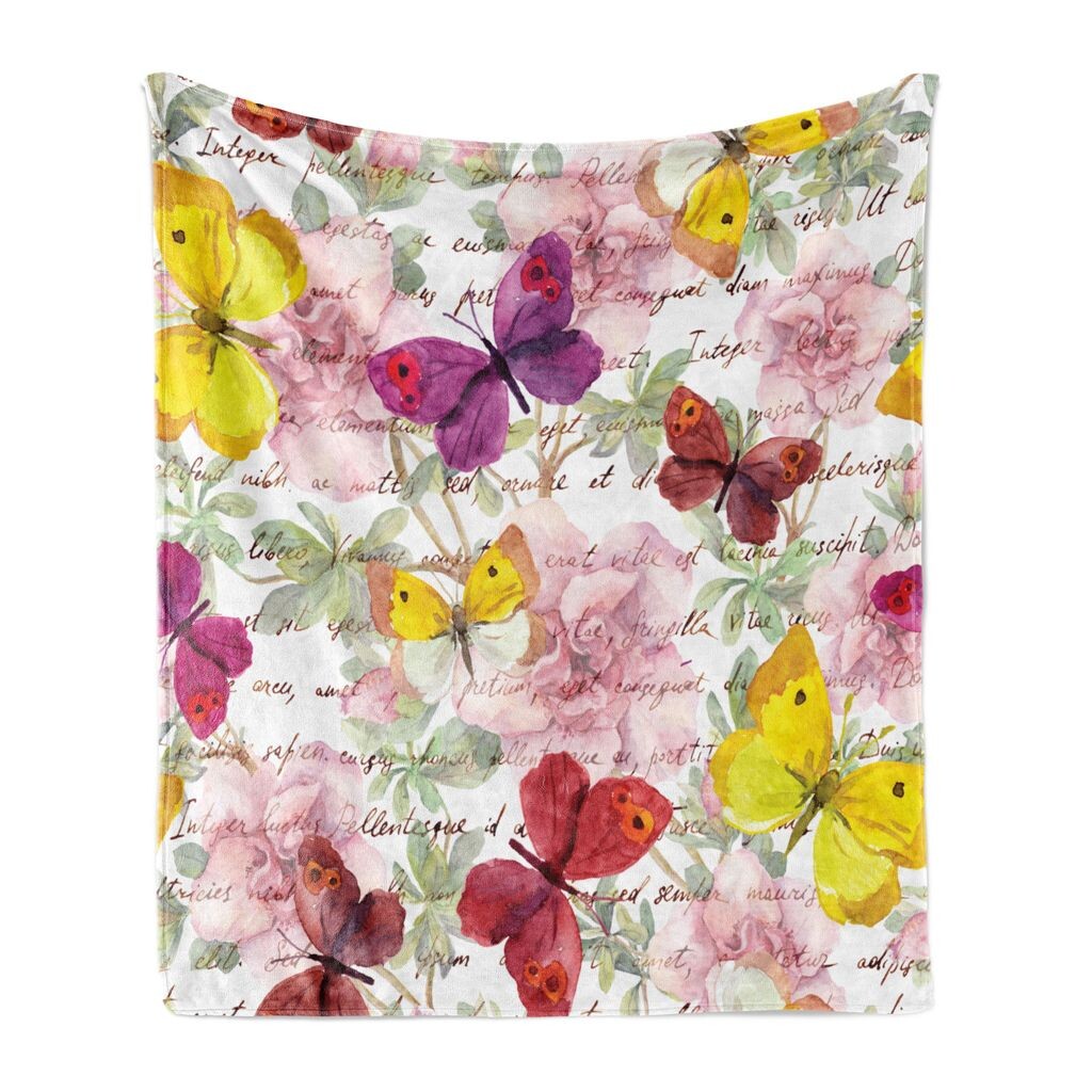 ABAKUHAUS Butterflies Мягкое фланелевое флисовое одеяло, цветы и текст «Камелия» Любовное письмо Романтическая каллиграфия Классический антиквариат, 175 x 230 см, разноцветный