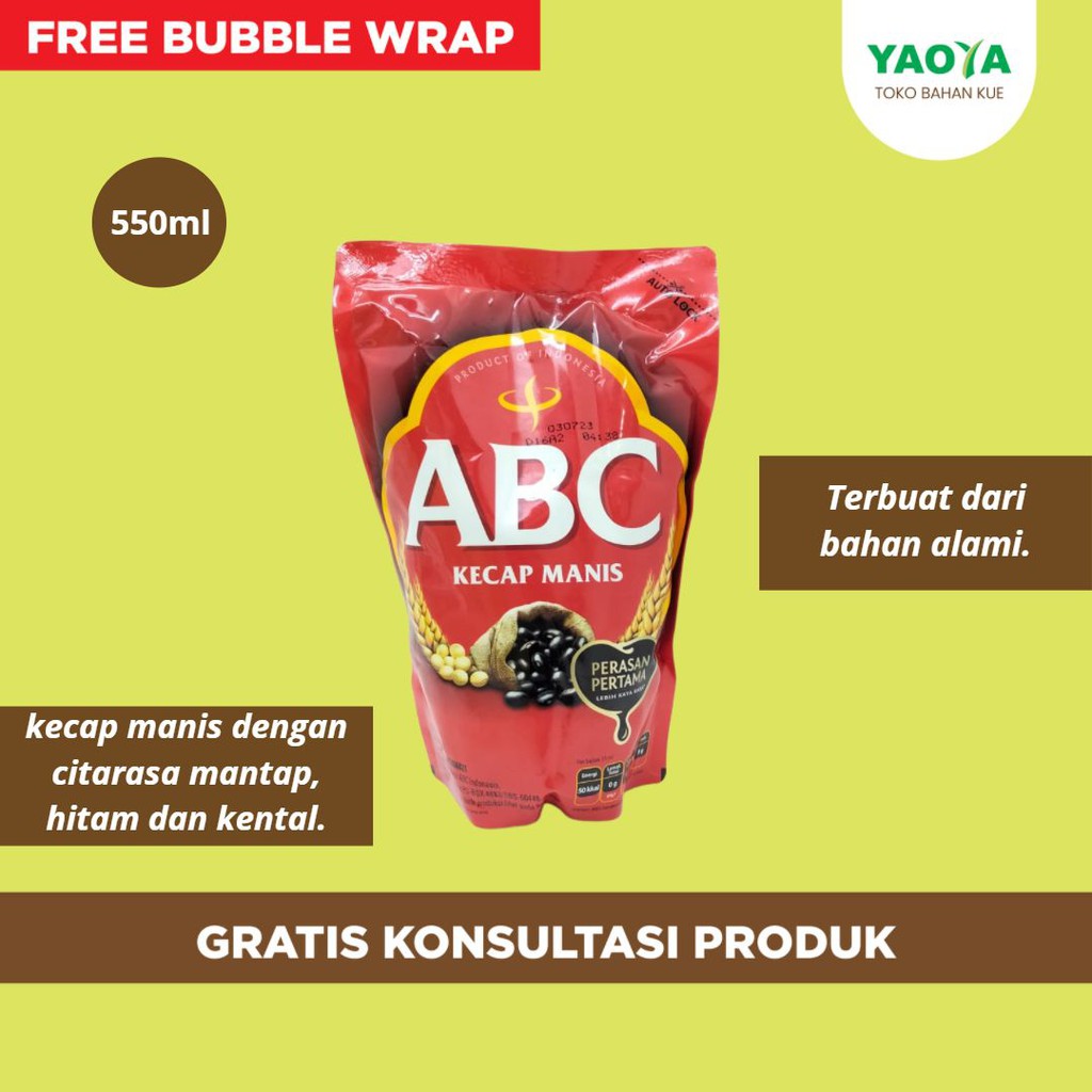 Kecap manis ABC dibuat dengan kedelai, gandum dan gula merah pilihan sehingga menghasilkan kecap manis dengan citarasa mantap, hitam dan kental. KOMPOSISI : Gula, air, garam, kedelai, biji gandum, pengawet natrium benzoat, pemantap nabati.