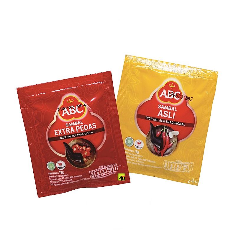 Saus Sambal ABC dgn kemasan sachet @18 gr. Praktis dan imut, dgn porsi yg pas. Cocok buat bekel perjalanan, atau bekal kantor, atau stok buat sendiri kek anak kos :D. Terbuat dari cabe asli dgn kualitas terbaik, dipetik-kemas-produksi secepatnya sehingga tidak kehilangan momen kesegaran yg diharapkan. Dijual dalam renceng dgn paket kelipatan 5 sachet. Produksi PT. Heinz ABC Indonesia, beratribut lengkap BPOM RI dan HALAL MUI.