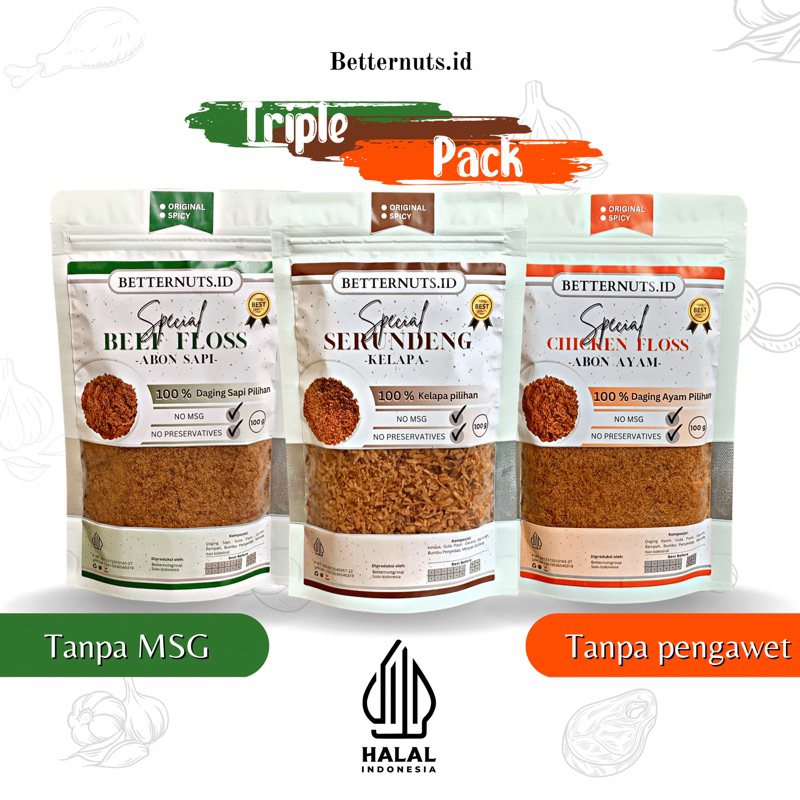 ABON AYAM ABON SAPI SERUNDENG TRIPLE PACK ABON SOLO SERUNDENG KELAPA ABON SAPI PEDAS ABON AYAM PEDAS