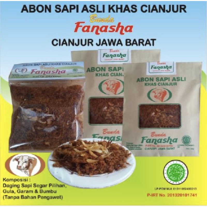 Abon sapi asli khas Cianjur BUNDA FANASHA. terbuat dari daging sapi fresh pilihan tanpa bahan campuran, dengan bumbu pilihan, higienis, halal dan nikmat