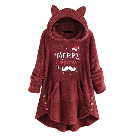Coopserbil Women s Christmas Loose Fleece Top Long Sleeve Cute Print Hooded Pocket Sweatshirt Womens Zip up Sweater Fleece Scrub Jacket