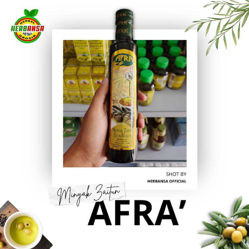 AFRA merupakan minyak zaitun extra virgin dari perasan pertama. Minyak zaitun extra virgin merupakan minyak terbaik karena memiliki kualitas yang lebih tinggi. Zaitun Extra Virgin bisa dikonsumsi dengan diminum atau dioleskan, bisa untuk campuran makanan atau masakan.