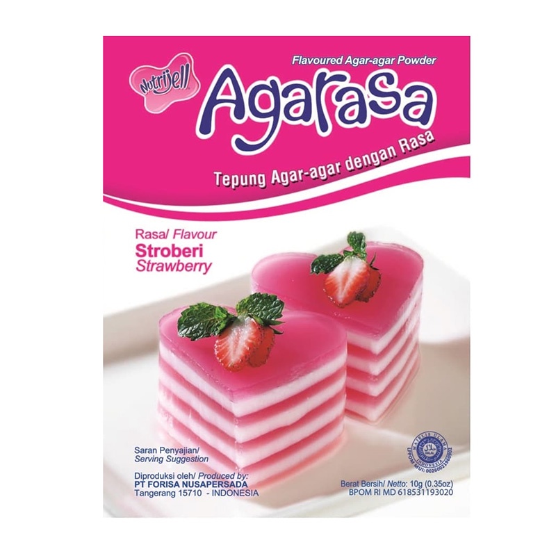 Agar-agar merupakan jenis makanan berbentuk kenyal atau jel yang diolah dari rumput laut atau alga terpilih, yakni rumput laut dari golongan phaeophycophta. Agar-agar juga dikenal sebagai makanan sehat karena mengandung serat lunak yang tinggi dan kalori yang rendah sehingga bermanfaat bagi kesehatan manusia. Manfaat agar-agar ini salah satunya adalah mampu membantu melancarkan pembuangan sisa-sisa makanan di usus. Agarasa hadir sebagai merk agar-agar yang dapat dikonsumsi manusia untuk mendukung kebutuhan manusia akan serat yang telah dilengkapi dengan rasa tertentu pada bubuknya. Agarasa Strawberry 10g merupakan produk agar-agar berupa bubuk dengan rasa stroberi yang menimbulkan sensasi segar dan aromanya yang sedap untuk dinikmati. Penambahan rasa stroberi sama sekali tidak mengurangi manfaat agar-agar bagi kesehatan manusia karena tidak mengandung pengawet dan pewarna yang berbahaya bagi kesehatan. Dikemas dalam bentuk plastik sederhana dan mudah disobek untuk memudahkan Anda menyajikannya bagi orang-orang kesayangan Anda. Untuk hasil agar-agar yang kreatif, Anda dapat menggunakan wadah bentuk lucu untuk menghasilkan agar-agar dengan bentuk yang menarik setelah didinginkan. Jadi, nikmati waktu seru Anda dengan Agarasa Strawberry 10G yang asyik dikunyah karena kekentalannya yang lembut di lidah dan rasa stroberinya yang menyempurnakan agar-agar menjadi lebih nikmat untuk dinikmati.