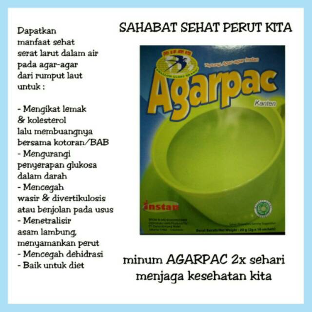 Minuman dari bubuk agar-agar untuk memenuhi kebutuhan serat tubuh. AGARPAC tidak berperisa. Bisa ditambahkan kedalam kopi,teh atau cukup dilarutkan dengan segelas air panas dan diminum selagi hangat.