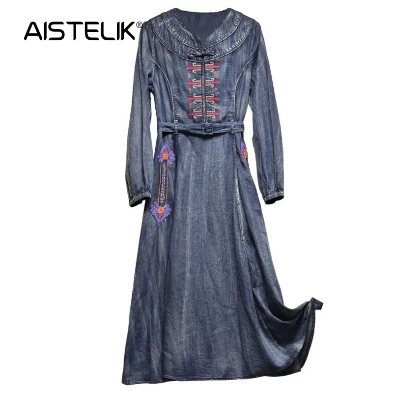 AISTELIK 2020 Весна-Осень-Зима Новая женская оригинальная брендовая тонкая джинсовая длинная одежда с поясом платье в стиле ретро с вышивкой