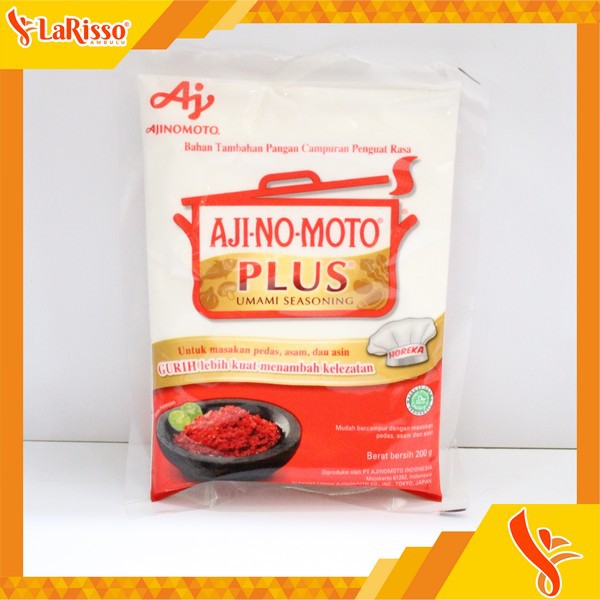 AJI-NO-MOTO PLUS adalah penguat rasa campuran yang merupakan kombinasi tiga bahan sumber rasa UMAMI yaitu, Mononatrium glutamat, Dinatrium 5 inosinat, dan Dinatrium 5 guanilat yang dapat ditemukan dalam bahan-bahan makanan. Mampu memberikan kelezatan yang begitu terasa pada makanan dengan pemakaian sedikit.