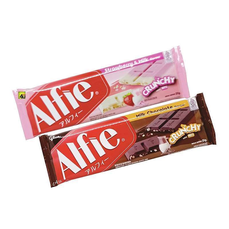 Alfie Chocolate adalah cokelat batangan yang lembut bercampur susu dan renyahan biskuit di dalamnya. Cokelat ini memiliki berbagai varian rasa dan dikemas dalam kemasan praktis.