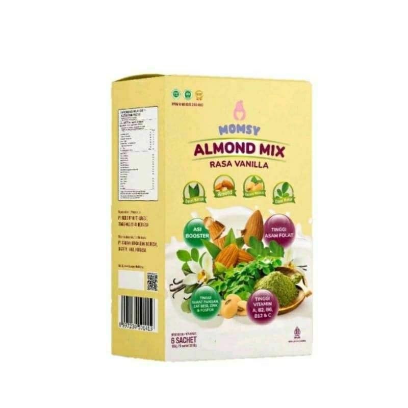 Momsy Almond Mix mengandung asam folat, serat pangan, zat besi, zink, fosfor, vitamin A, B2, B6, B12, dan C.