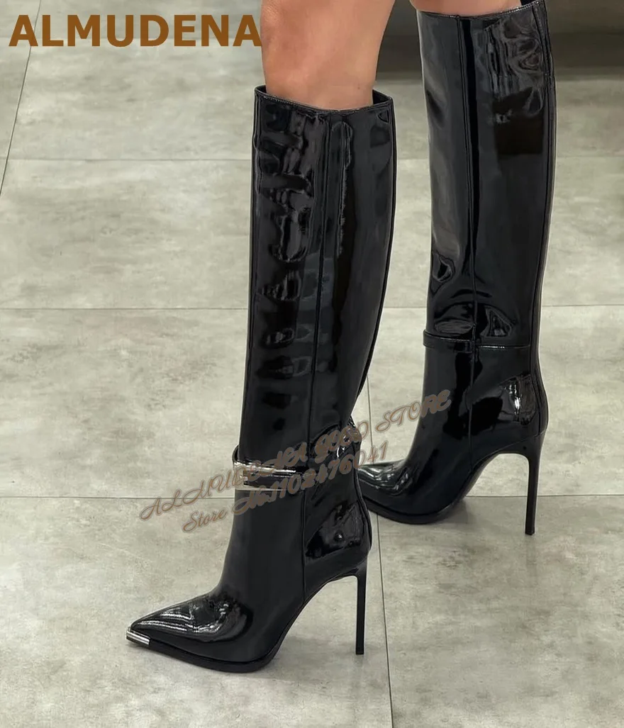 ALMUDENA Сапоги до колена с металлической пряжкой и ремешком на щиколотке Коричневые, черные сапоги на шпильке со стальным носком Высокие сапоги с ремешком Украшенные модельные туфли