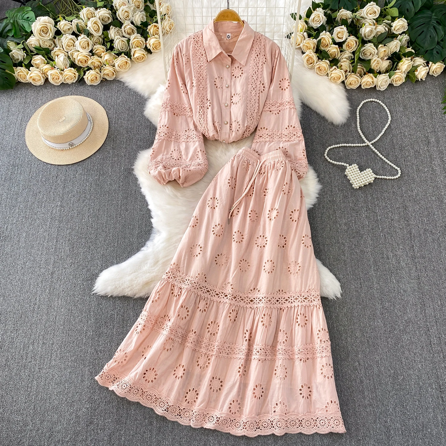 ALPHALMODA Осень 2025 г., Крючок Цветок, Полая кружевная отделка, Рубашка с рукавами-фонариками + Эластичная высокая талия, Юбка, Костюм из 2 предметов, для женщин