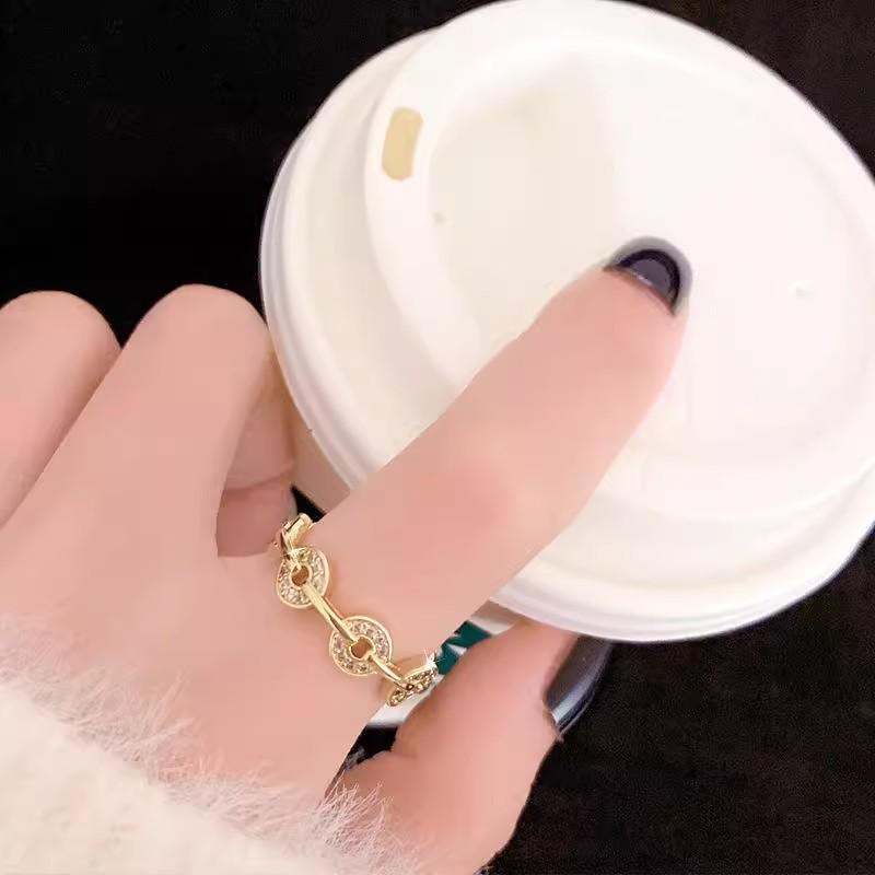 ANENJERY Геометрическое циркониевое полое круглое кольцо с цепочкой для женщин, ниша, высокое роскошное ретро универсальное изысканное кольцо, ювелирный подарок золотой