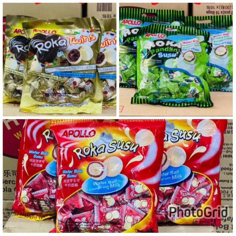 Apollo Roka wafer bola rasa pandan susu, roka twins, roka susu. coklat bentuk bola dengan wafer yang renyah di balut kacang. camilan kesenangan anak - anak.