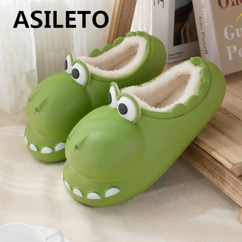 ASILETO, симпатичные зимние хлопковые тапочки с динозаврами для влюбленных, женские нескользящие теплые ботинки из ЭВА с мультяшным рисунком д...