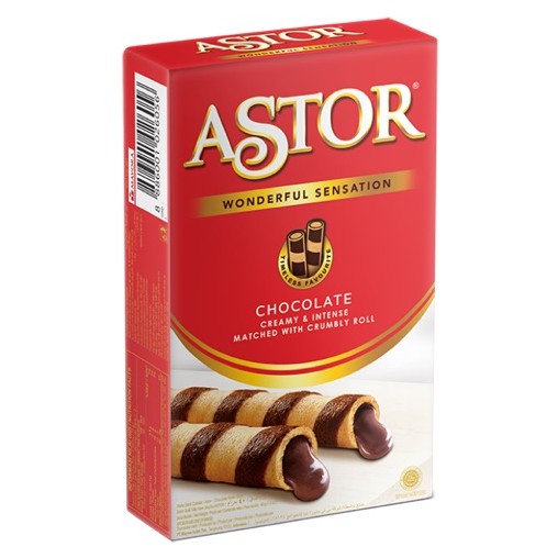 ASTOR Coklat wafer roll dengan tekstur rasa sensasional yang sangat renyah dan isi coklat yang banyak.