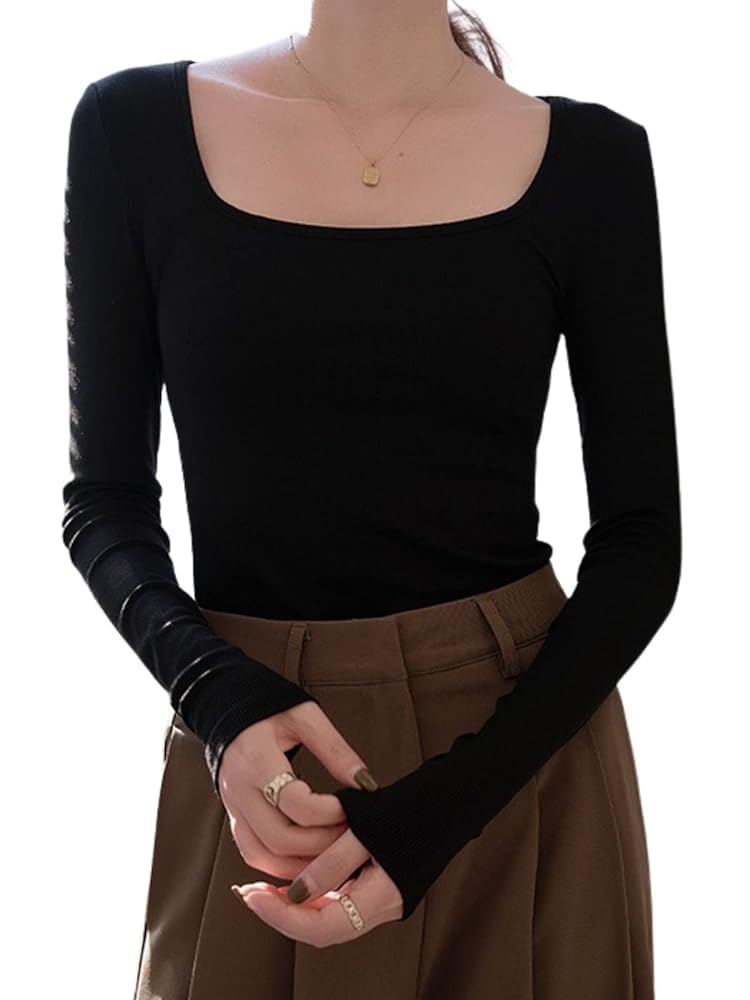 AUSKY для очень долгой поездки на работу футболки женские, топы, рукава, нижнее белье, облегающие, грудь, U-образный вырез, однотонные, в рубчик, футболки, повседневные, элегантные, свитер, чёрный