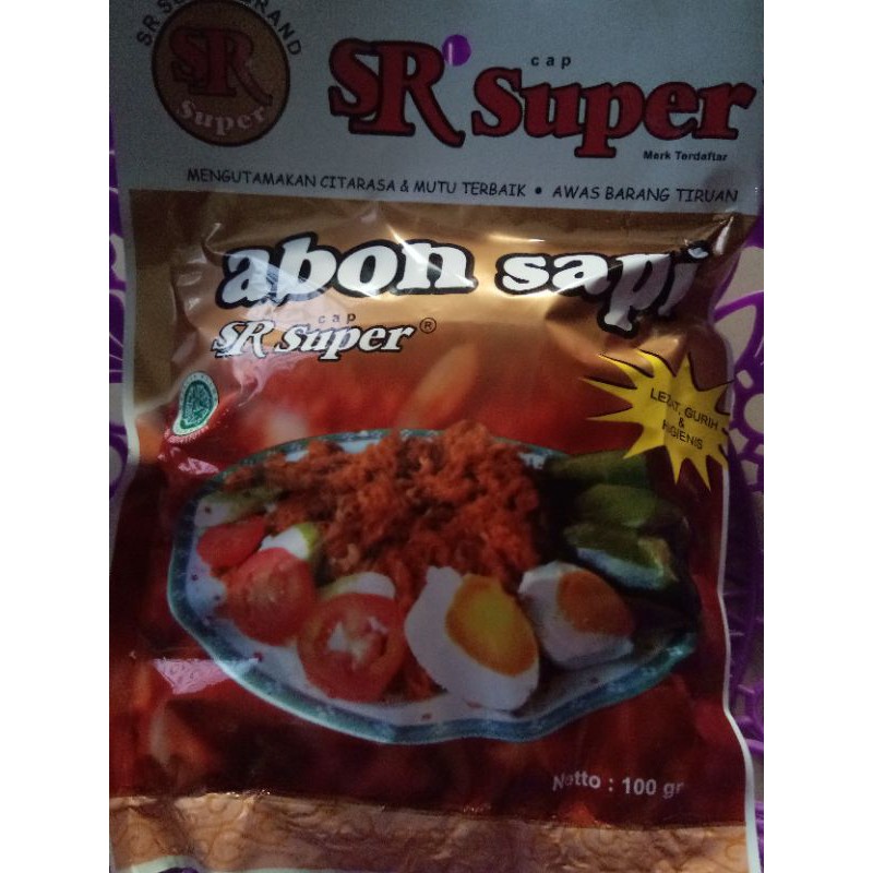 Abon sapi sr super terbuat dari daging sapi pilihan dan bumbu-bumbu berkualitas baik.sangat lezat untuk lauk pauk,dicampur dengan roti/burger & bubur.