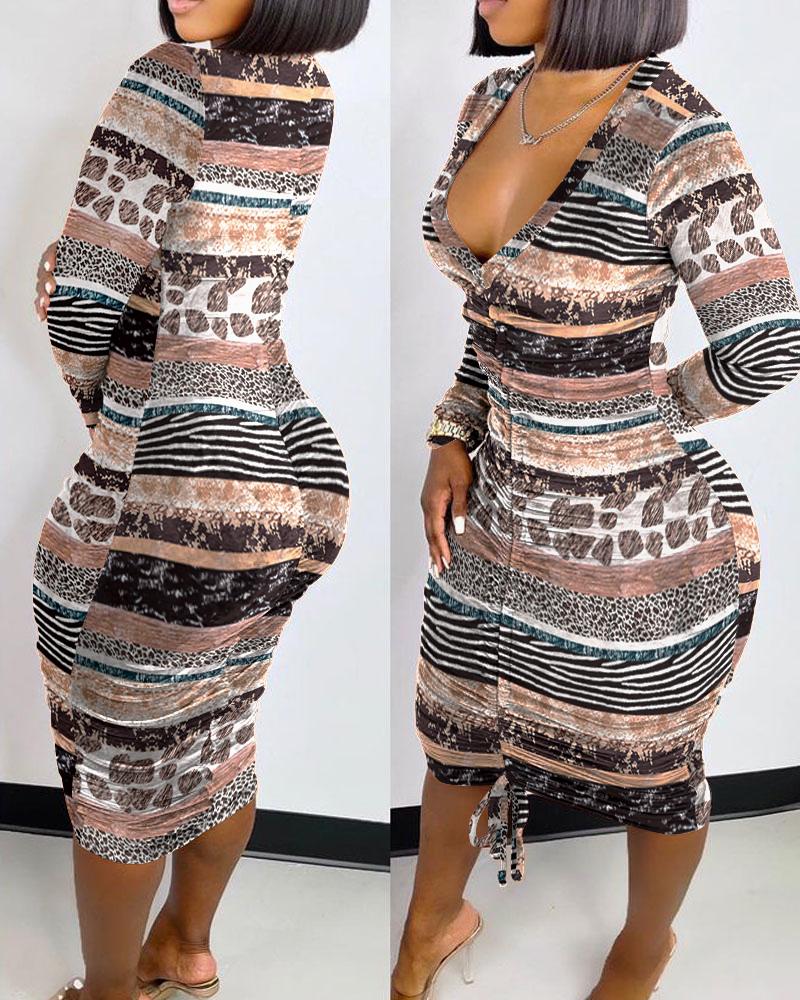 Abstract Leopard Print Drawstring Ruched Bodycon Dress, Multicolor