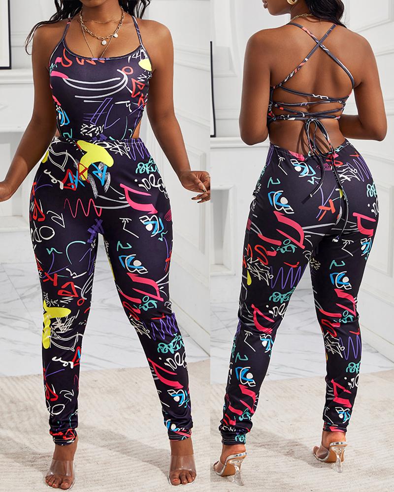 Abstract Print Crisscross Backless Jumpsuit, Black