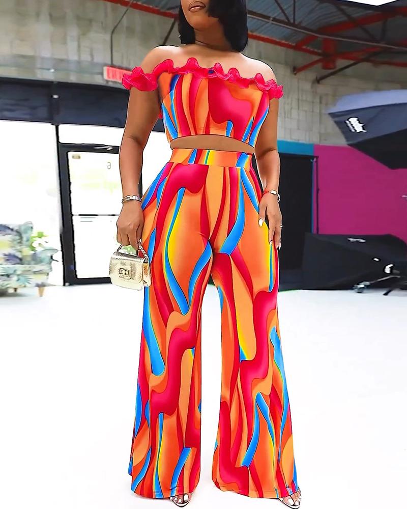 Abstract Print Off Shoulder Ruffles Top & Bootcut Pants Set, Red