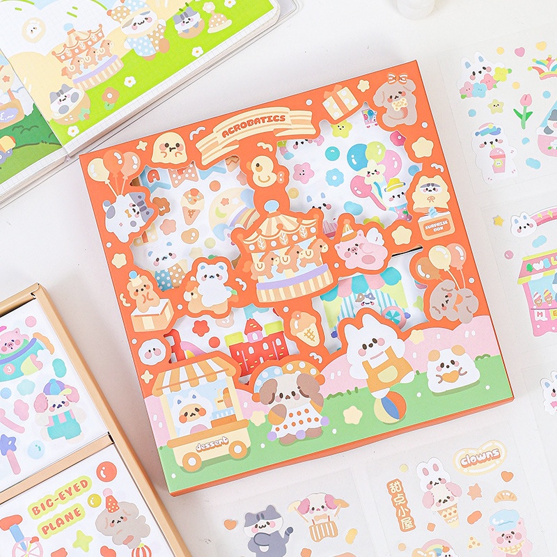 Satu kotak stiker Acrobatics Animal berisi ratusan stiker mini dengan karakter binatang yang imut-imut, cocok untuk dikoleksi dan atau di-sharing dengan teman, khususnya jika kamu menyukai tema festival yang ceria.