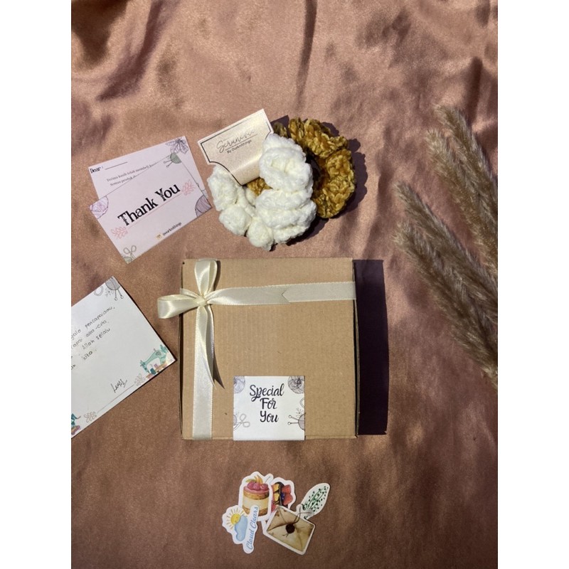 1 box maksimal isi 4 scrunchie, sudah termasuk gift card (bisa request isiannya apa),thank you card & free stiker” lucu dan aesthetic