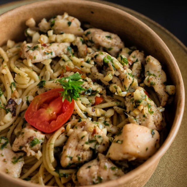 Pasta dengan bawang putih yang banyak dengan olive oil , dada ayam yang tender dan rempahan chili flakes bagi yang suka pedes cus di pesen.