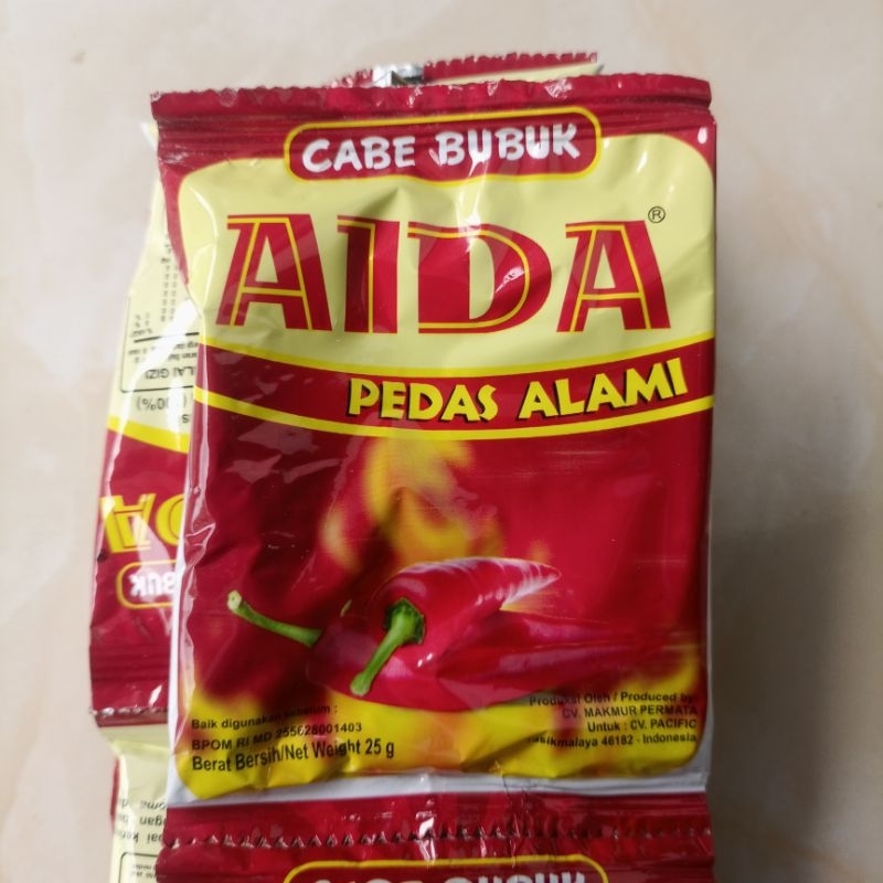 Cabe bubuk kering merek Aida cocok di gunakan untuk aneka makanan seperti makanan ringan,bakso,mie ayam,siomay .Dll.