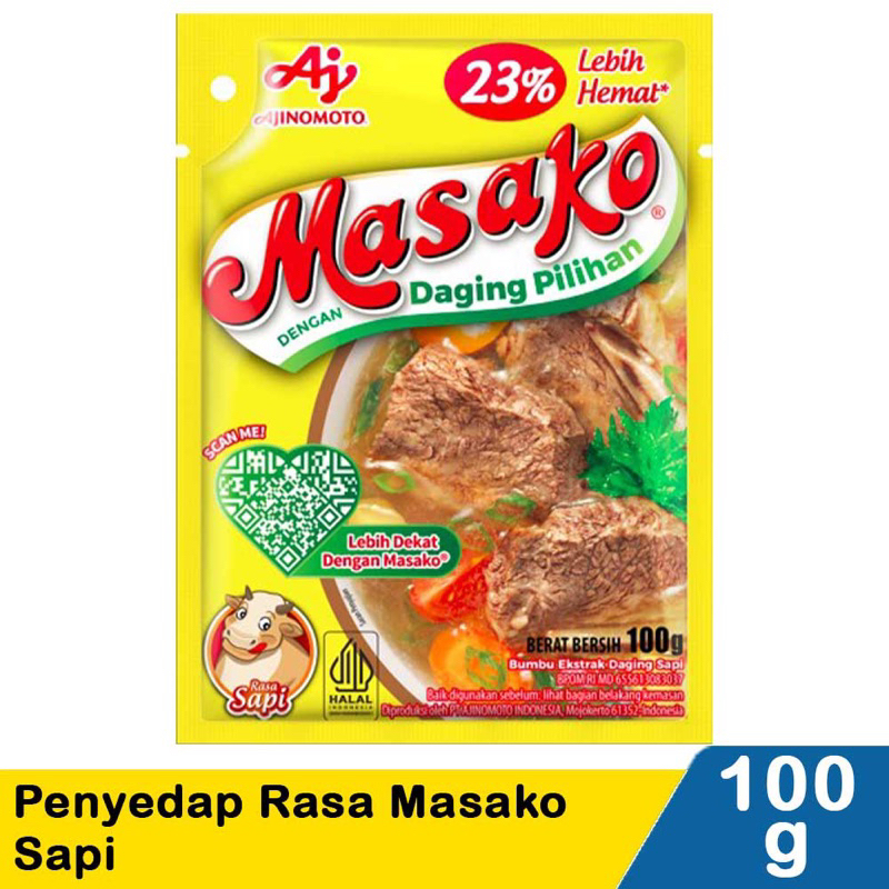 Masako bumbu ekstrak daging sapi, dibuat dengan perpaduan tepat antara daging segar berkualitas, bumbu, dan rempah pilihan yang memberikan rasa dan aroma masakan dari daging asli sama seperti kaldu buatan dirumah.
