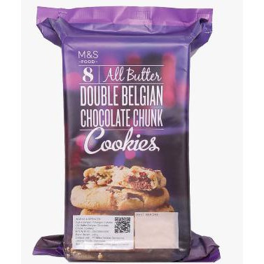 Wheatflour contains Gluten (with Wheatflour, Calcium Carbonate, Iron, Niacin, Thiamin) Belgian Dark Chocolate Chunks (22%) (Sugar Cocoa Mass Cocoa Butter Emulsifier: Soya Lecithin Flavouring) Salted Butter (19%) (Butter (Milk) Salt) Sugar Belgian Milk Chocolate Chunks (11%) (Sugar Dried Whole Milk Cocoa Butter Cocoa Mass Emulsifier: Soya Lecithin Flavouring) Raising Agent: Sodium Bicarbonate, E503, E450 Flavouring Salt. Dark Chocolate contains Cocoa Solids 39% minimum. Milk Chocolate contains Cocoa Solids 25% minimum, Milk Solids 19% minimum.