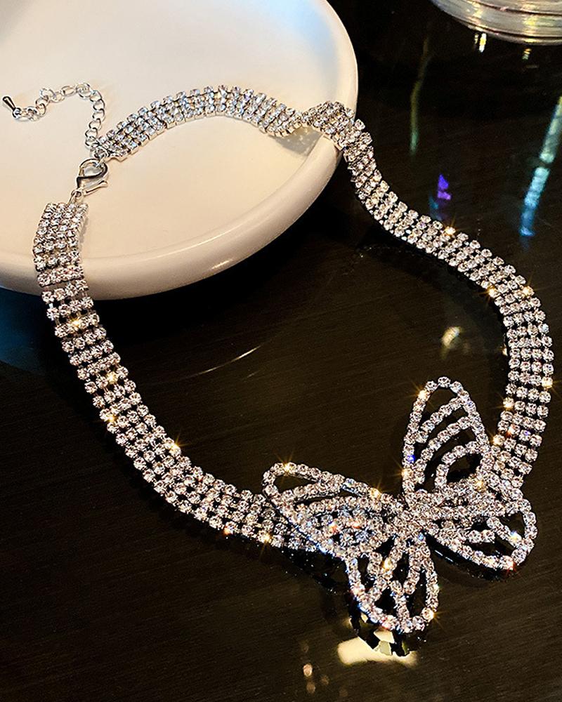 Allover Rhinestone Butterfly Pattern Necklace, Silver