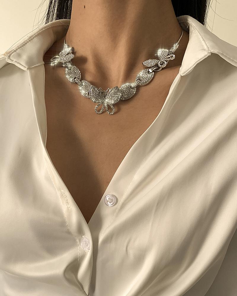 Allover Rhinestone Butterfly Pattern Retro Necklace, Silver