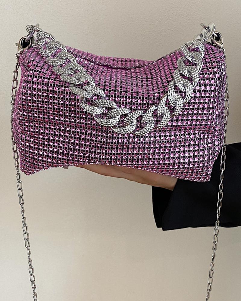 Allover Rhinestone Chain Strap Fashionable Bag, Pink