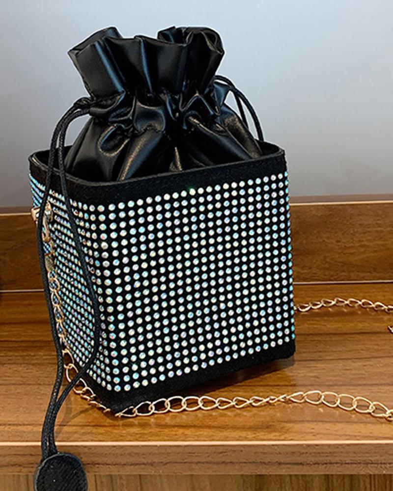 Allover Rhinestone Drawstring Bucket Bag, Black