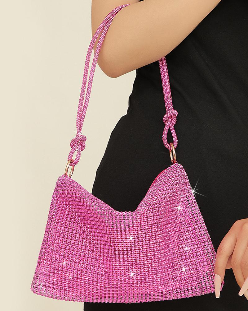 Allover Rhinestone Zipper Design Evening Shoulder Bag, Hot pink