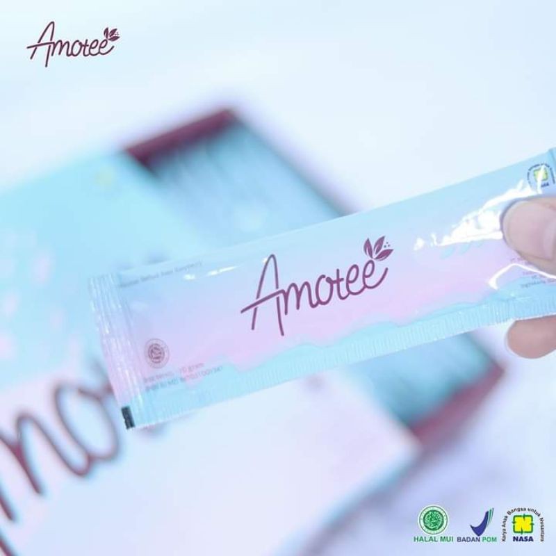 Amotee merupakan campuran Herbal seperti Fish Collagen, L-Glutathion, Phyto ceramid, Sakura ektrak, Teripang, Plum, Sodium hyaluronat Vitamin c yang mempunyai manfaat membantu menjaga kesehatan kulit.