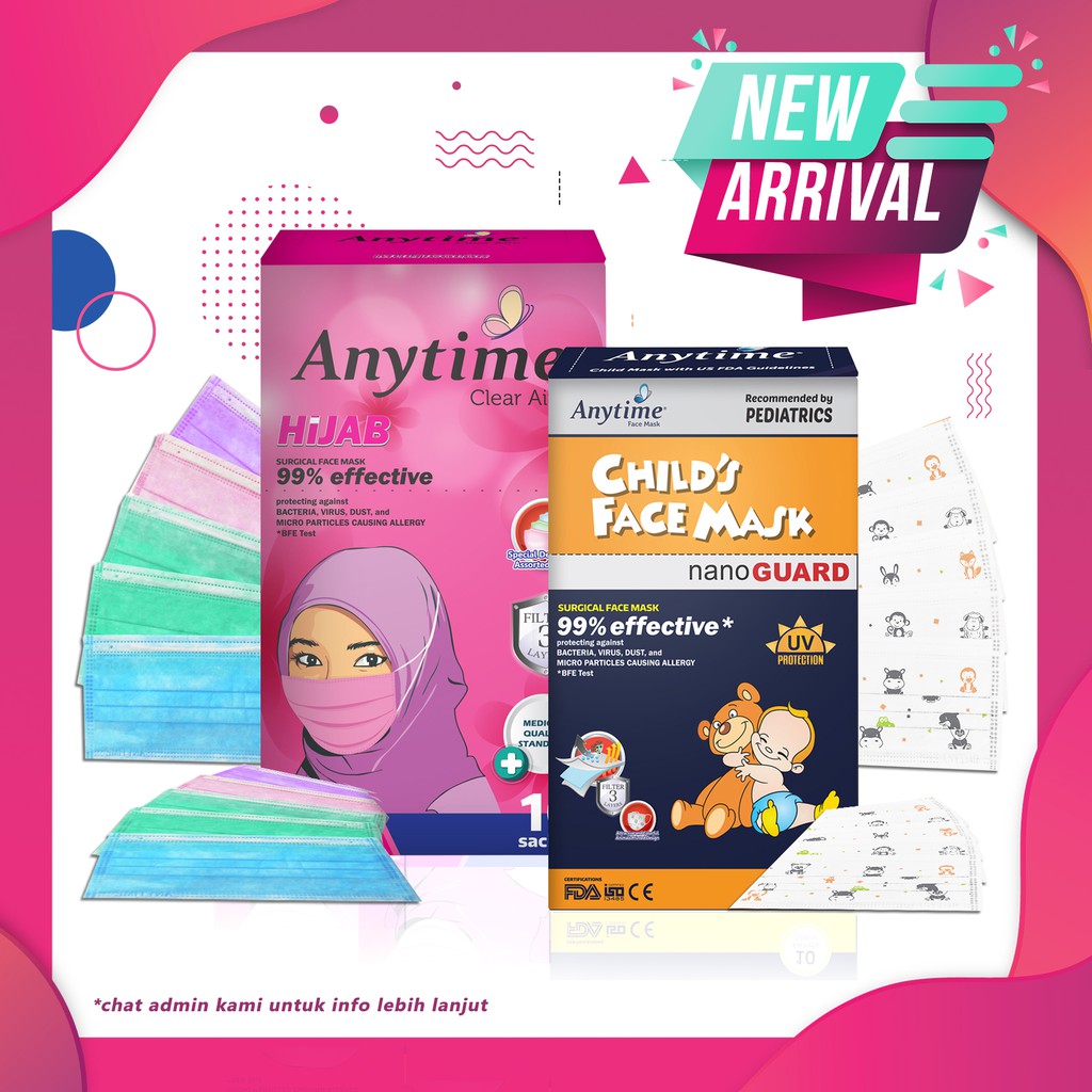 HIJAB (NON MOTIF) : Menggunakan bahan hygienis dan bebas allergy dengan Form Fit Design Nose-Piece dan Latex-Free Hijab Headloop ssehingg anyaman digunakan dan menutup hidung dengan sempurna, Terdapat 3 design dan warna yang sangat serasi untuk dipadukan dengan warna hijab. Cocok untuk pemakai hijab atau digunaan untuk klinik, rumah sakit, atau pemakaian sehari-hari. Tersedia dalam kemasan eklusive dan menarik 5 pcs dan POP UP display. Ukuran masker 18 x 9,5 cmAnytime Mask 3-ply Earloop Surgical Printed Child Face Mask adalah masker khusus untuk anak yang dapat melindungi resiko terpapar dari sinar ultraviolet, debu, asap kendaraan, polusi udara, bakteri, virus - dengan Nano Guard technology yang dapat menyaring hingga 99% partikel yang berukuran 0,3 micron. Menggunakan bahan hygienis dan bebas allergy dengan Form Fit Design Nose-Piece sehingga nyaman digunakan dan menutup hidung dengan sempurna. Terdapat UV PROTECTION & juga terdapat berbagai macam gambar hewan lucu pada masker dan juga packaging nya. Ukuran masker 14,5 x 8,5 cm#anytime #skrinner #sensi #sensimasker #diapro #masker #maskerkain #hijab #ladies #kesehatan #kecantikan #health