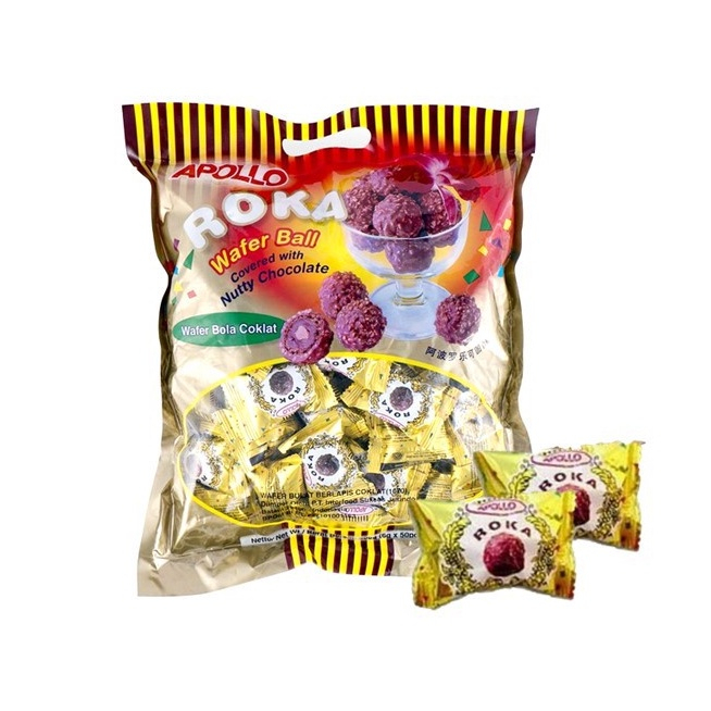 Apollo Roka Chocolate Wafer Ball merupakan wafer ball yang dibalut dengan rasa cokelat yang lumer dimulut,renyah,dan lezat Apollo Cokelat Roka aman dikonsumsi serta dikemas dengan praktis,sehingga dapat dibawa kemana saja atau dapat dinikmati saat santai Anda bersama keluarga dirumah.