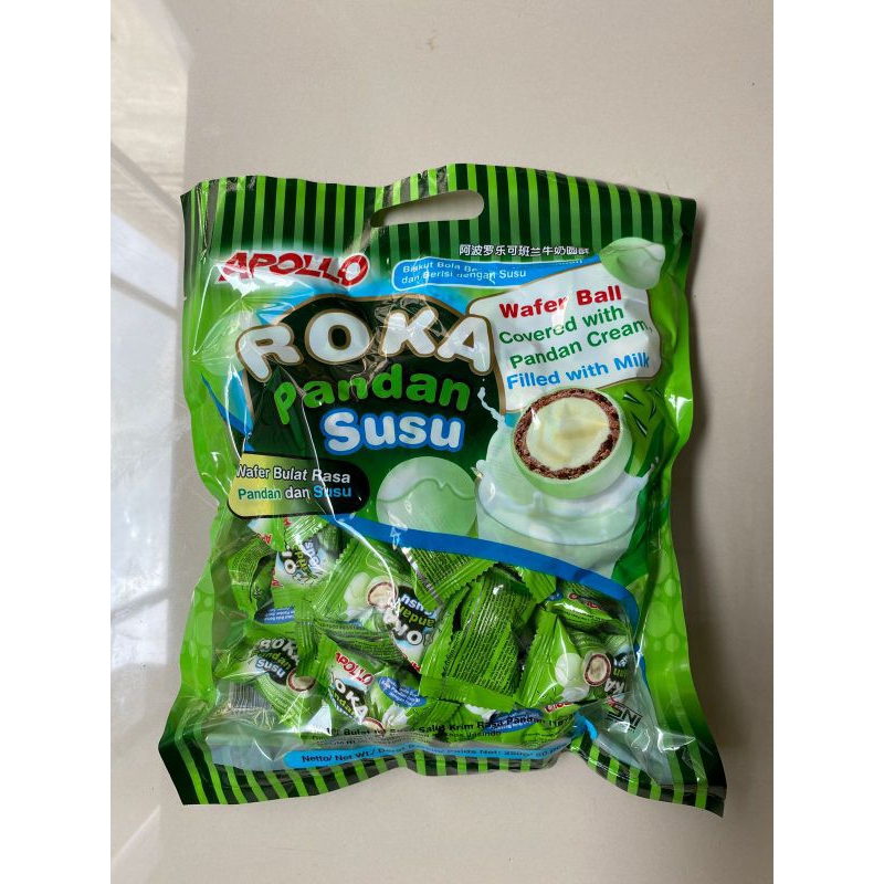 Apollo Roka Rasa Pandan isi 50 pcs/250g merupakan wafer ball yang dibalut dengan rasa cokelat yang lumer dimulut,renyah,dan lezat Apollo Cokelat Roka aman dikonsumsi serta dikemas dengan praktis,sehingga dapat dibawa kemana saja atau dapat dinikmati saat santai Anda bersama keluarga dirumah