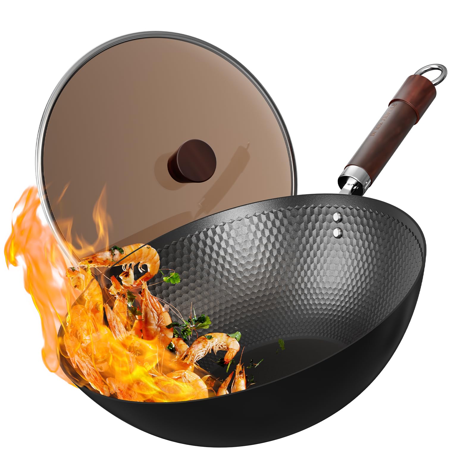 Armorbear Чугунный вок со стеклянной крышкой, 30 см, Углеродистая сталь, Плоское дно, Подходит для индукционных плит, Тройная нитридная обработка для высокой устойчивости к ржавчине