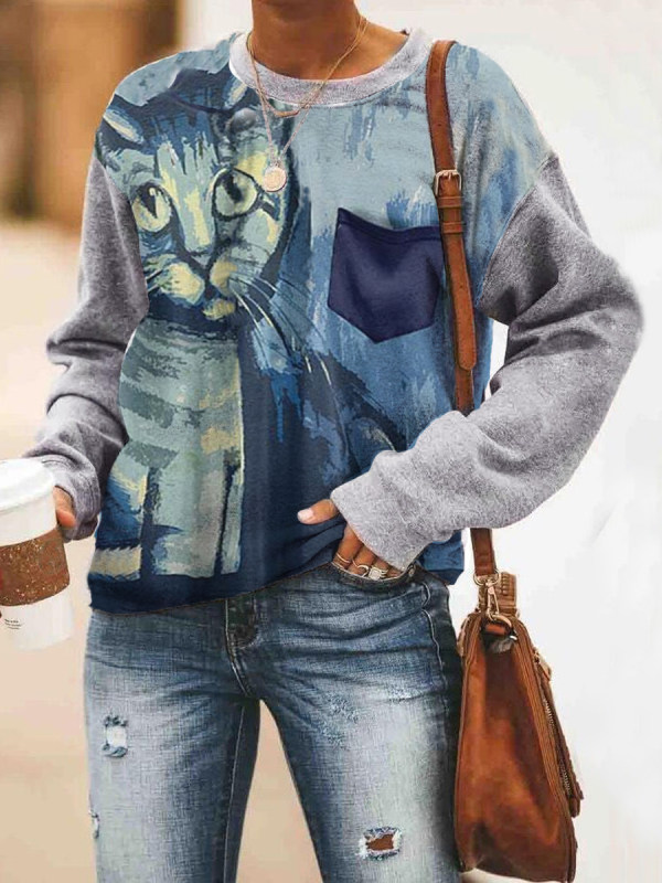sweatshirts,art cat print contrast sleeve sweatershirt