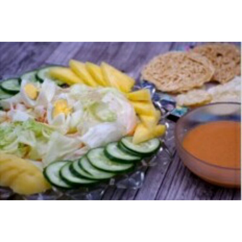 Bumbu kacang, Kyuri, Lettuce, Nanas, Kentang, Wortel, Kol, Kerupuk Mie